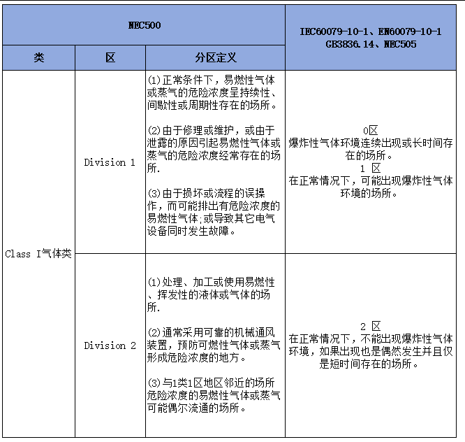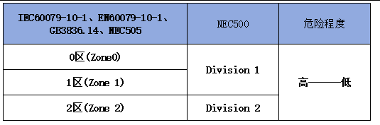 北美NEC500标准与IEC、EN、GB在危险场所划分的区别: