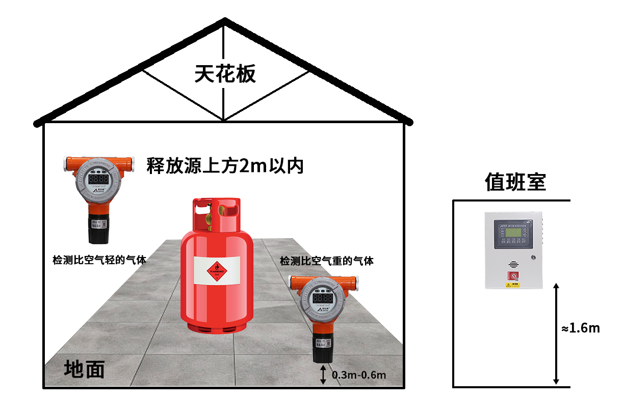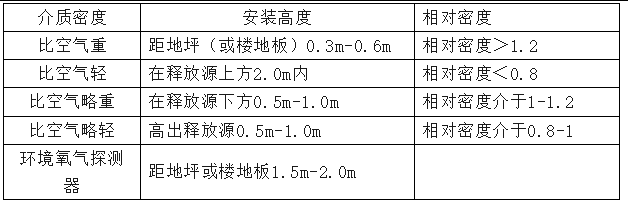气体比空气轻,那么泄漏后就容易向上方扩散,所以探测器要往高处安装,反之假如气体比空气重,泄漏后就容易在地坪附近聚集,所以探测器要安装在地坪高度附近。
